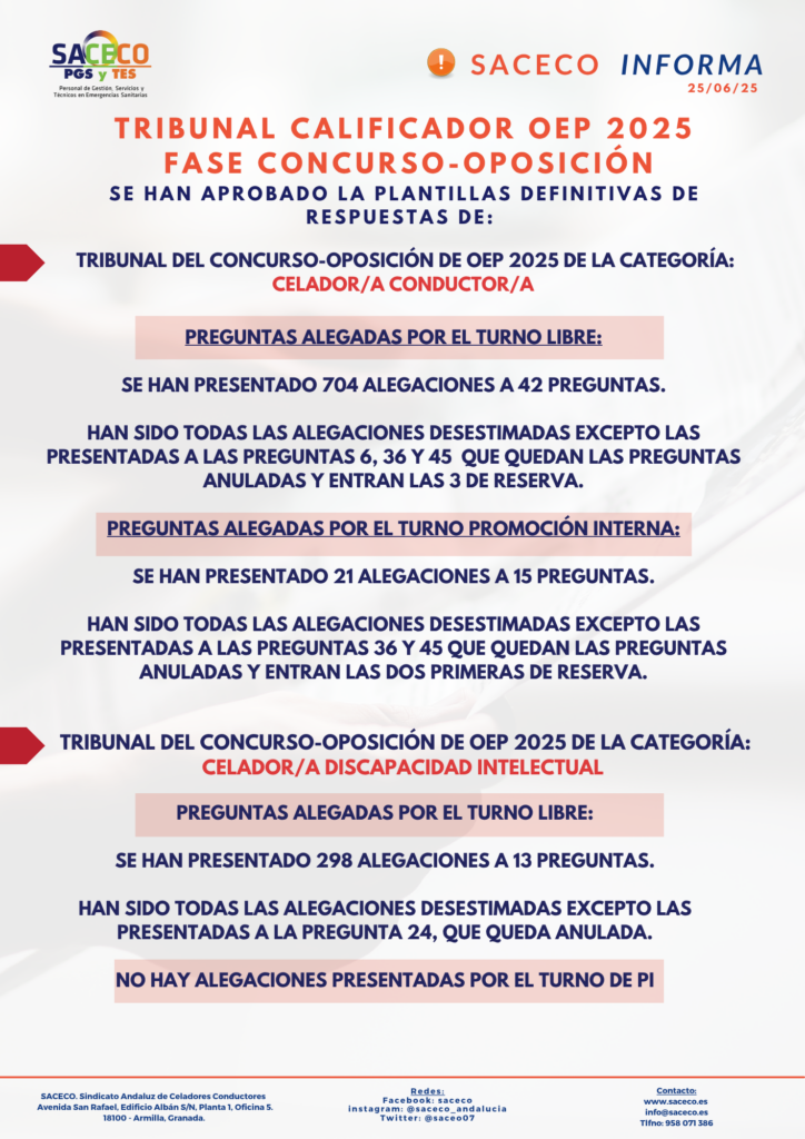 🔸Aprobadas las plantillas definitivas de Celador DI y Celador Conductor – Siguiente paso corregir los exámenes. Os mantendremos informados. 👉🏻A la espera de aprobar plantillas definitivas de Celador turno libre.
