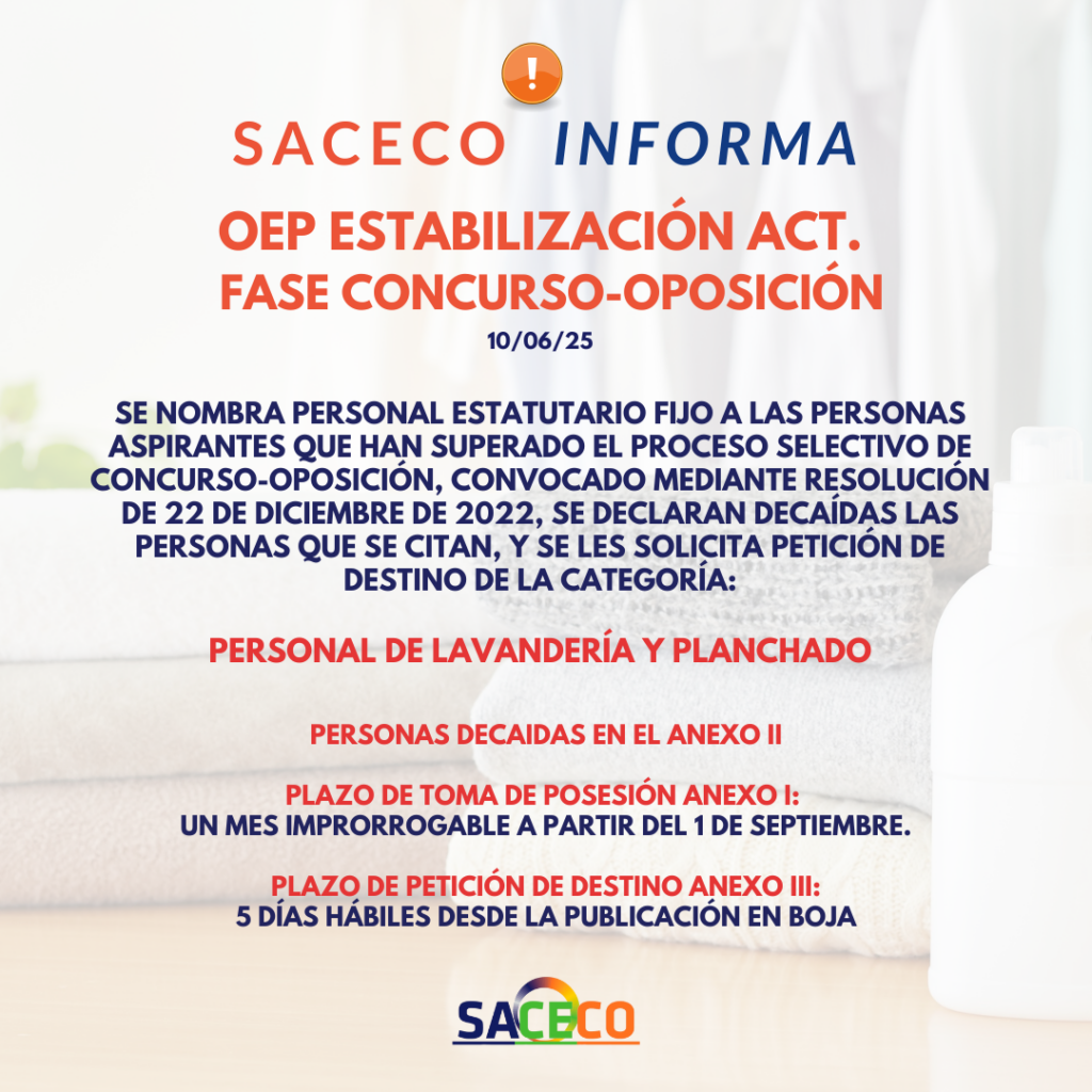 Nombramientos y adjudicación de plazas de PERSONAL DE LAVANDERIA Y PLANCHADO – Turno libre. OEP Extraordinaria. Decreto Ley 12/2022. Centros SAS. Concurso-Oposición
