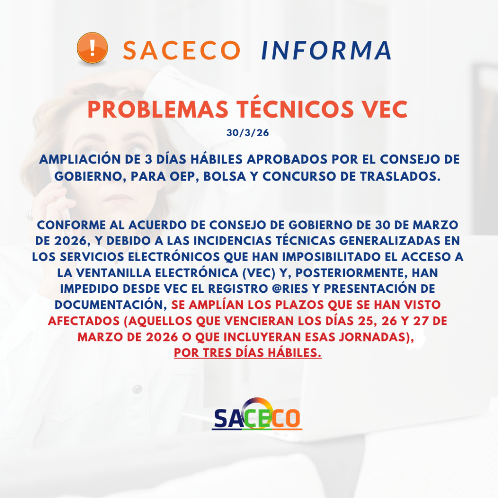 INCIDENCIAS VEC-AMPLIACIÓN DE 3 DÍAS HÁBILES APROBADOS por EL Consejo de Gobierno, para OEP, Bolsa y Concurso de Traslados.