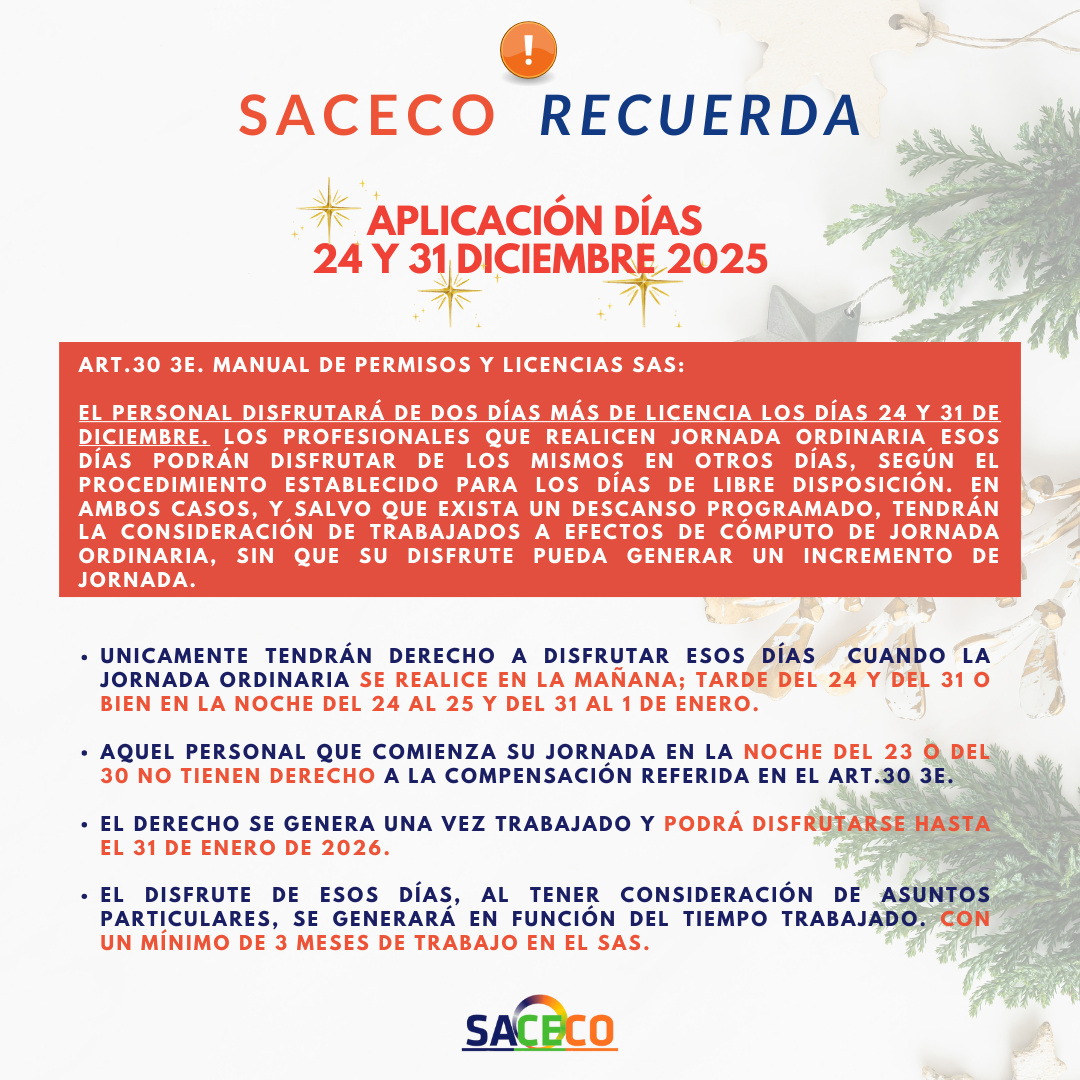 SACECO RECUERDA: APLICACIÓN 24 Y 31 DICIEMBRE DÍAS TRABAJADOS EN EL SAS